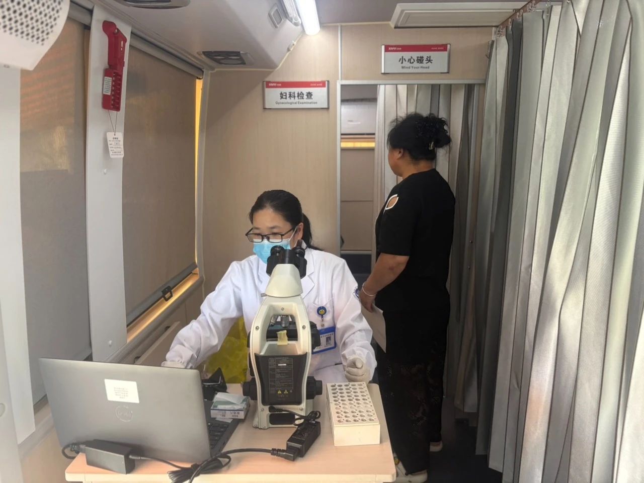 這輛裝備精良、功能齊全的“兩癌篩查車”穩(wěn)穩(wěn)停靠在西新村村委會門口。它麻雀雖小,五臟俱全,車內(nèi)配備了先進的乳腺彩超、婦科檢查床、HPV采樣等專業(yè)